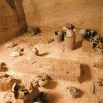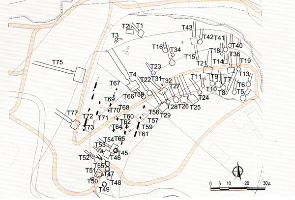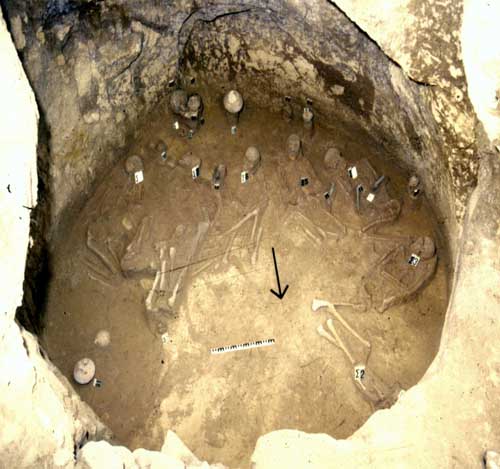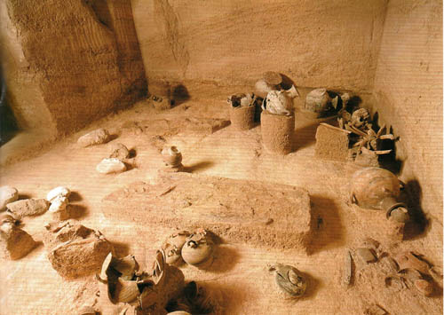 Νοτιοανατολικά του οικισμού εκτείνεται το νεκροταφείο το οποίο καταλαμβάνει μία έκταση 18 στρεμμάτων και είναι οργανωμένο σε επάλληλα άνδηρα. Οι 77 θαλαμωτοί οικογενειακοί τάφοι χρονολογούνται από το 1.500-1.050 π.Χ. και παρουσιάζουν μεγάλη ποικιλία τόσο ως προς την αρχιτεκτονική τους όσο και ως προς την κτέρισή τους. Τους νεκρούς συνόδευαν στο τελευταίο τους ταξίδι αντικείμενα (αγγεία, κοσμήματα, εργαλεία και όπλα), υποδηλώνουν την ευημερία των κατοίκων της μυκηναϊκής εγκατάστασης, αλλά και τις εμπορικές και πολιτιστικές τους επαφές με άλλες περιοχές του μυκηναϊκού κόσμου αλλά και της Μεσογείου.